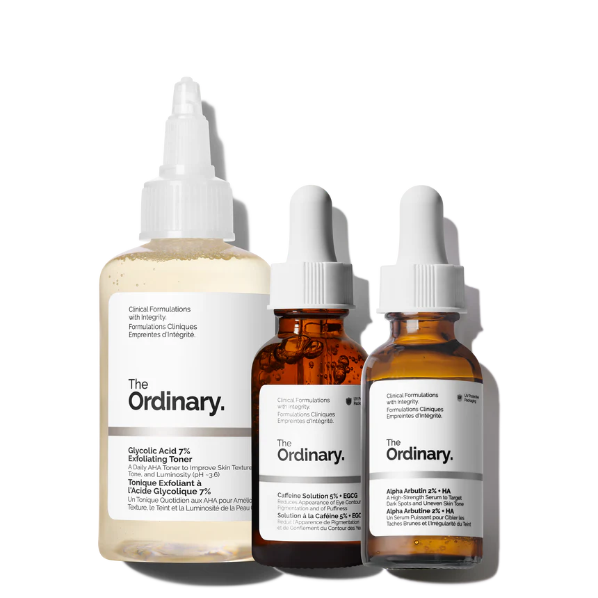 Un régimen personalizado de tres pasos para potenciar la luminosidad, diseñado para unificar el tono de la piel, suavizar la textura y revitalizar el contorno de los ojos. Con el tónico de Ácido Glicólico, el suero de Alpha Arbutin y el suero de cafeína para ojos, este set ilumina la piel opaca y combate las ojeras y la hinchazón.