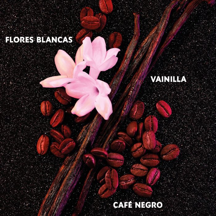 La apertura juega con matices de pera, mandarina verde y pimienta rosa que despiertan los sentidos. El corazón se ilumina con jazmín sambac, flor de azahar y un toque de canela. Finalmente, la base combina café negro, vainilla intensa, patchouli, ambrox y maderas cálidas, generando una estela adictiva y duradera.